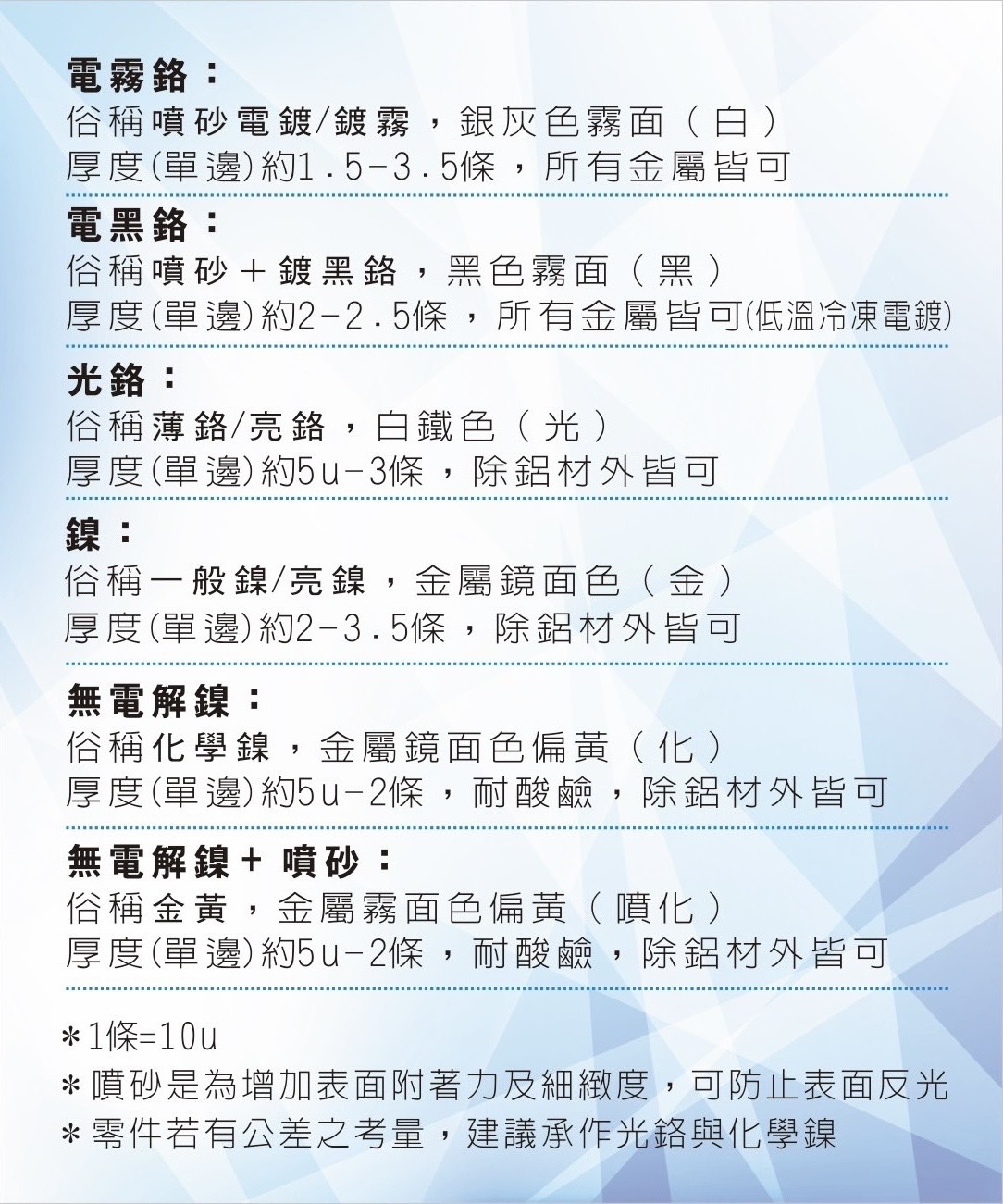 厚度(單邊)約2-2.5條,所有金屬皆可(低溫冷凍電鍍)。